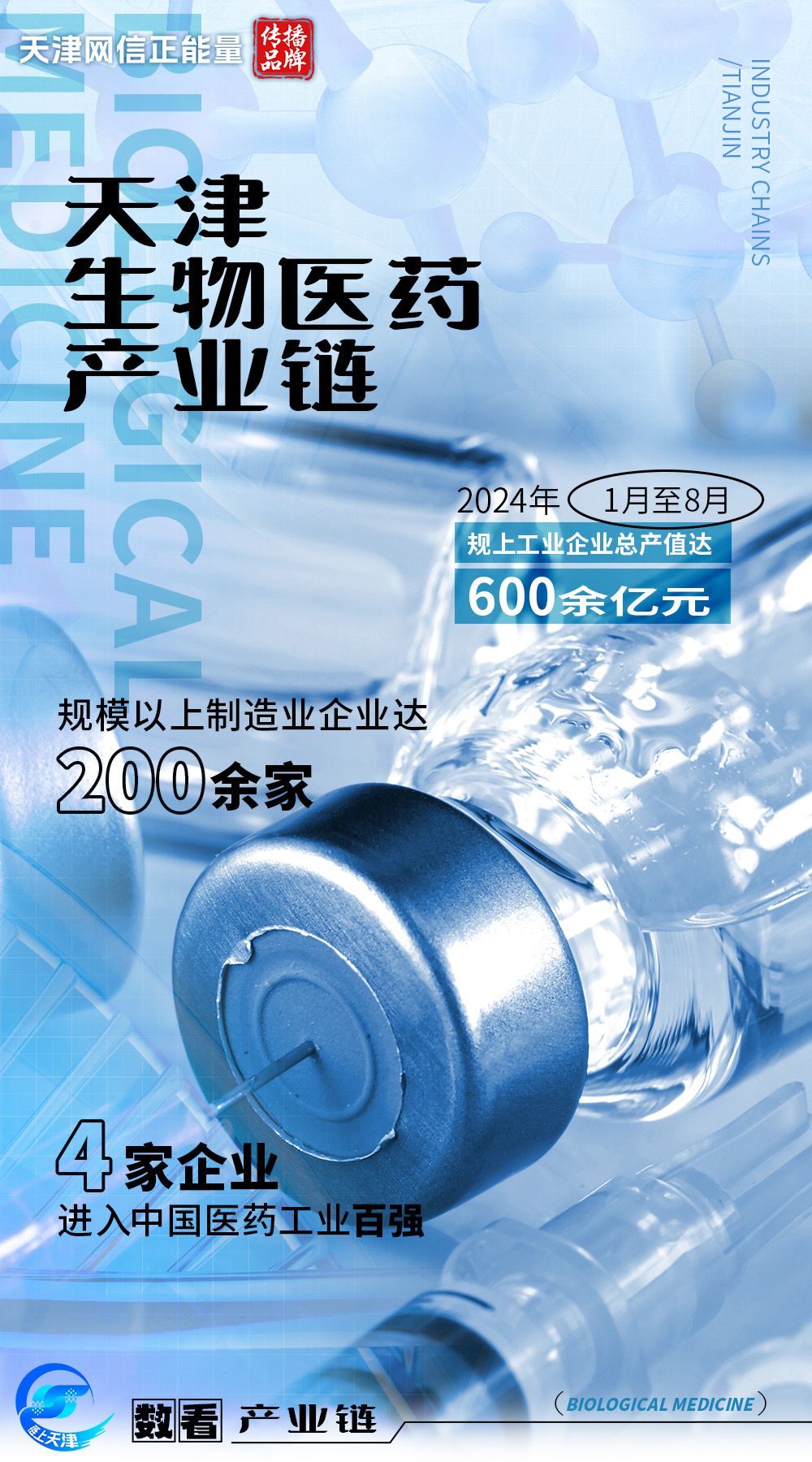 抓好生物医药产业重点项目、支持生物医药载体和园区建设、布局生物医药产业新赛道……天津聚集起生物医药企业超千家,规模以上工业企业达220余家,诺和诺德、医药集团、天士力集团、红日药业4家企业进入中国医药工业百强,同时拥有主板上市公司11家,市级专精特新企业138家,国家级专精特新小巨人企业22家,市级单项冠军企业14家。京津冀生命健康先进制造业集群成为首个入选“国家队”名单的先进制造业集群。2024年1月至11月,天津生物医药产业规上工业企业营业收入总规模达880余亿元,预计到2025年,我市生物医药产业规上工业企业营业收入总规模超千亿元。