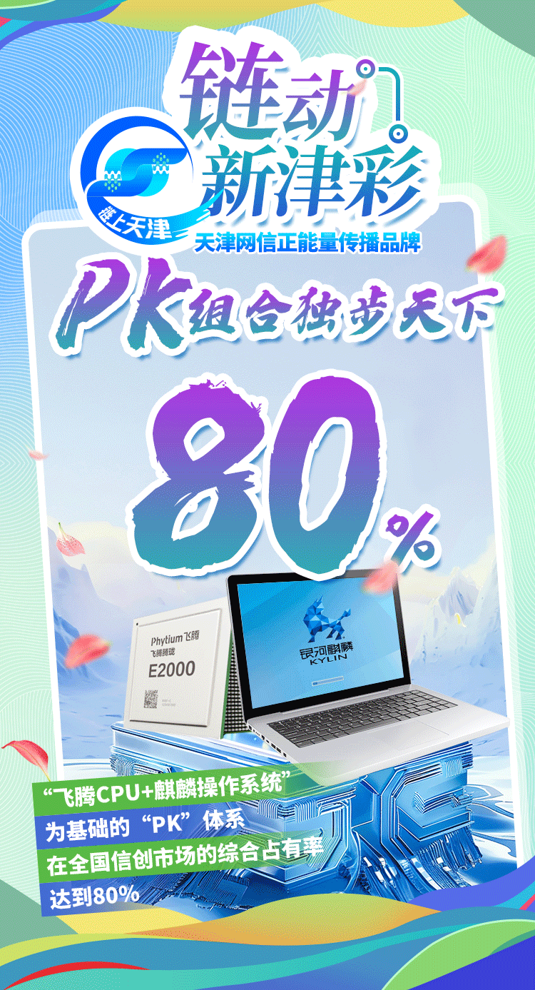 作为滨海新区“信创谷”的坚实底座,飞腾、麒麟组成的“PK”体系,逐步成为信创产业的“双子星”,在信创市场的综合占有率达到80%。