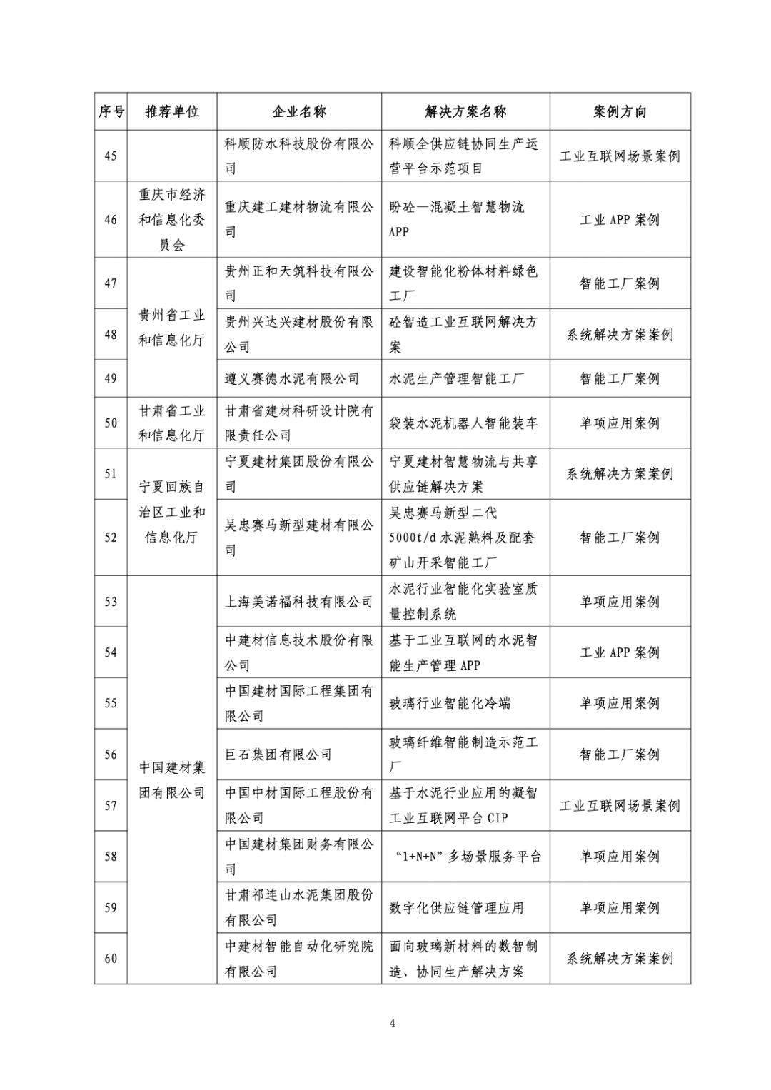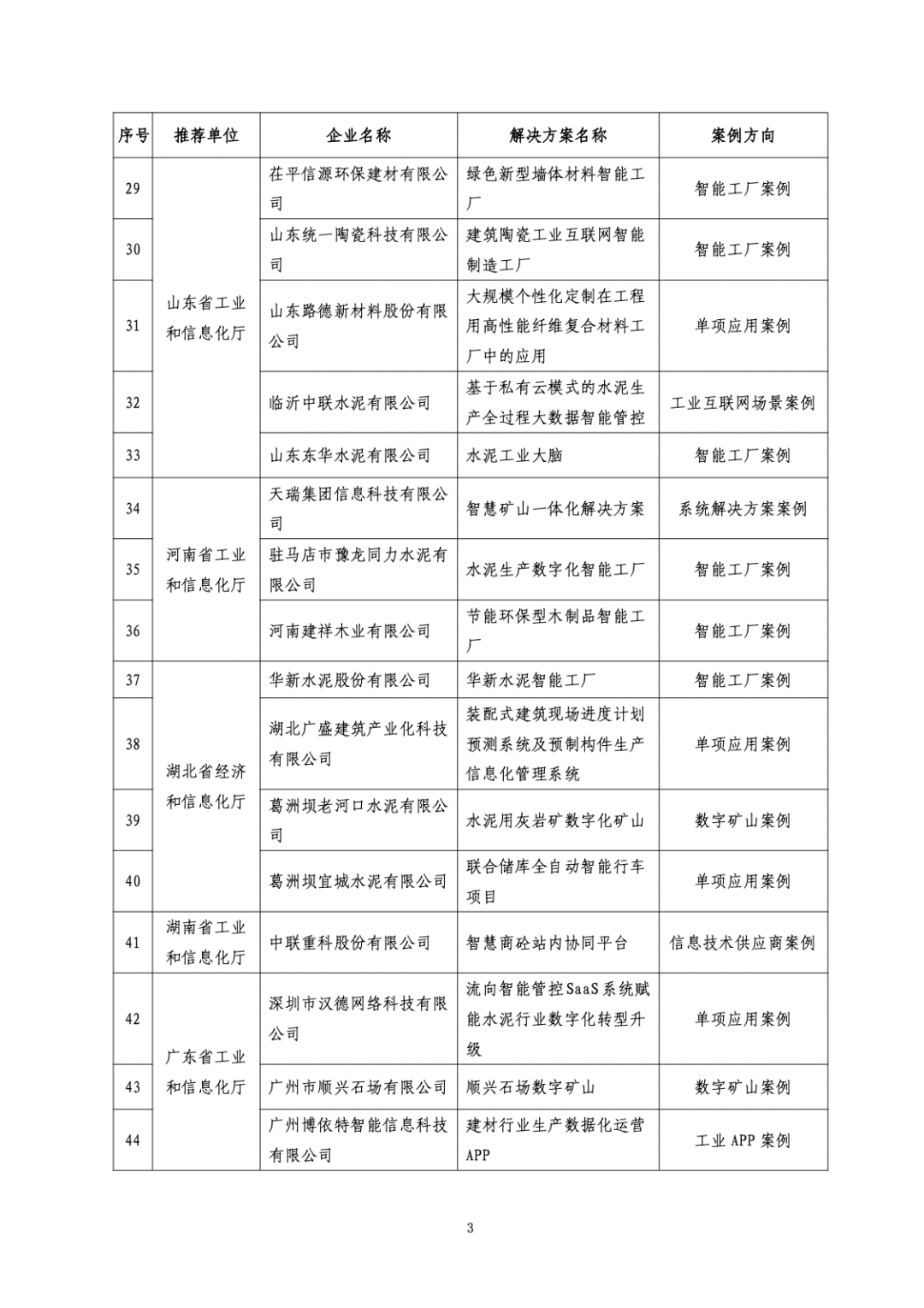 近日,经地方推荐、专家评审,工业和信息化部原材料工业司发布2022年60个建材工业智能制造数字转型典型案例,涵盖信息技术供应商、系统解决方案、工业互联网场景、工业APP、智能工厂、数字矿山、单项应用等7个方向。发布案例是为了落实《建材工业智能制造数字转型行动计划(2021-2023年)》(工信厅原[2020]39号),在行业内形成一批可复制、可推广的成果,宣传推广经验做法,推动建材工业与新一代信息技术在更广范围、更深程度、更高水平上实现融合发展。这些案例具有一定的代表性,为建材工业智能制造提供了有益探索。