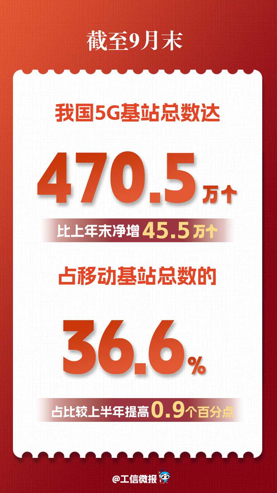 5G网络服务能力持续升级。截至9月末,5G基站总数达470.5万个,比上年末净增45.5万个,占移动基站总数的36.6%,占比较上半年提高0.9个百分点。