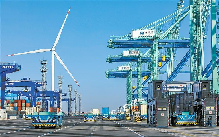 冬日暖阳下,在天津市滨海新区的天津港北疆C段智能化集装箱码头,一批人工智能运输机器人整齐列队,将被装船发往阿联酋阿布扎比港。与传统人工集装箱码头相比,这些不知疲倦的“大块头”作业效率提升超20%,助力天津港大型集装箱设备自动化率超88%。