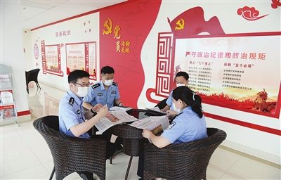 市纪委监委驻市公安局纪检监察组利用廉洁文化长廊共享空间,设置报刊书架,组织干部深入学习市第十二次党代会精神。