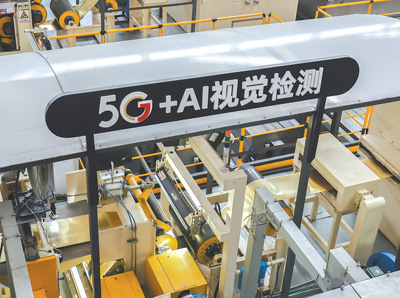 浙江宁波市金田铜业铜带生产车间利用“5G+AI(人工智能)视觉检测”技术,对产品表面进行检测。