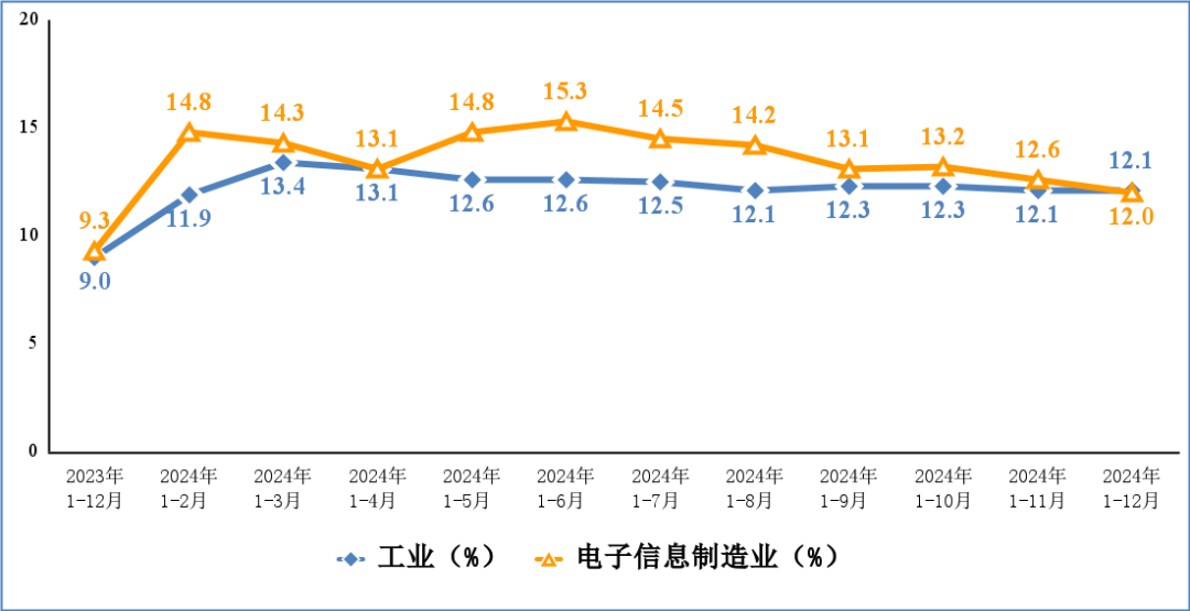 2024年,电子信息制造业固定资产投资同比增长12%,较1—11月回落0.6个百分点,比同期工业投资增速低0.1个百分点,比同期高技术制造业投资增速高5个百分点。